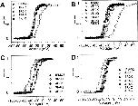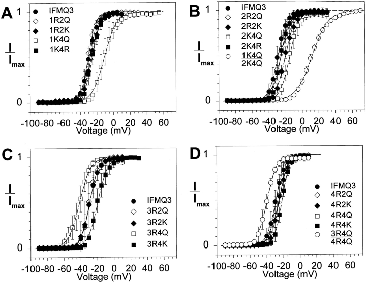 Figure 3. Effects of S4 mutations on the voltage dependence of activation. Xenopus oocytes were injected with RNA encoding the IFMQ3 channel or each of the S4 mutants, along with RNA encoding the β1 subunit. Currents were recorded from a holding potential of −100 mV by depolarizations ranging from −90 to +55 mV, as described in materials and methods. The fraction of sodium channels activated at each potential was determined, and is plotted as a function of voltage. Data are shown for the mutants in domains I (A), II (B), III (C), and IV (D). Data for the double mutants are shown in B and D. The data points represent the means of at least three determinations and the error bars show the standard deviations. The smooth lines are fits to a two-state Boltzmann function, as described in materials and methods. The parameters of the fits are included in Table I.