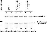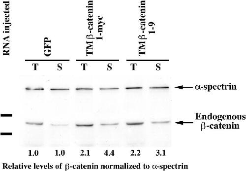 Figure 3. Overexpression of TMâβ-catenin results in the stabilization of endogenous β-catenin. Injection of 1.25 ng of control RNA (GFP), TMâβ-catenin 1-myc RNA, or TMâβ-catenin 1â9 RNA demonstrates overexpression of both forms of TMâβ-catenin results in an increase in the steady-state levels of endogenous β-catenin in both total (T) and soluble (S, nonâcadherin-bound) lysates. In this experiment, two-cell stage embryos were injected with RNA at four sites, followed by protein extraction at stage 7. To control for protein loading, all endogenous β-catenin bands were normalized to α-spectrin signals from the same Western blot. Numbers below each lane represent the relative level of endogenous β-catenin in each sample (control levels were assigned a value of 1.0). Molecular mass markers indicated are 113 and 75 kD.