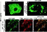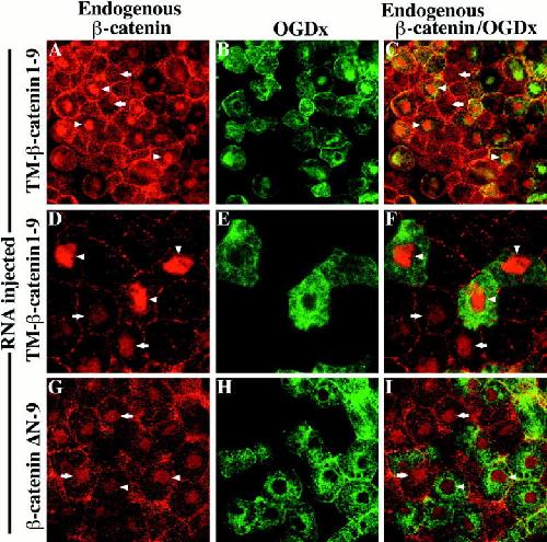 Figure 4. Overexpression of TMâβ-catenin results in the accumulation of endogenous β-catenin in the nucleus. RNA encoding TMâ β-catenin 1â9 (AâF) was coinjected with Oregon green dextran (OGDx; B, E, and H) as a lineage tracer to determine the effect of TMâ β-catenin overexpression on the distribution of endogenous β-catenin (A, C, D, and F). Merged images (C and F) demonstrate that cells overexpressing TMâβ-catenin 1â9 possess high levels of endogenous β-catenin in nuclei (arrowheads) in contrast to that observed in nonexpressing cells (arrows). Overexpression of ÎN-9 β-catenin (GâI), that does not promote axis duplication, does not affect the levels of endogenous β-catenin in the nucleus (G and I; arrowheads mark nuclei of cells expressing the ÎN-9 mutant and arrows mark nuclei of nonexpressing cells).