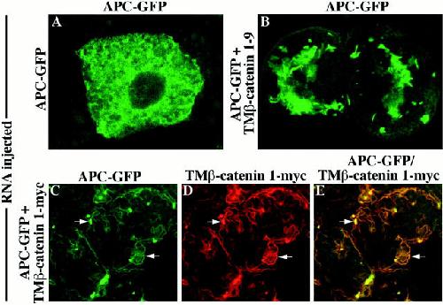 Figure 6. Overexpression of TM–β-catenin results in the redistribution of APC–GFP in animal cap cells. Intracellular distribution of APC–GFP in the absence (A) or presence (B) of TM–β-catenin 1–9. Coexpression of TM–β-catenin 1–9 causes a dramatic redistribution of APC–GFP from a diffuse cytosolic pattern (A) to an apparent association with the secretory apparatus (B). The interaction between TM–β-catenin and APC–GFP was further demonstrated by coexpressing an myc-tagged TM–β-catenin mutant (TM–β-catenin 1-myc) with APC–GFP and examining the pattern of each protein in animal cap cells. Both TM–β-catenin 1-myc (C) and APC–GFP (D) proteins display an overlapping intracellular distribution seen in the merged image (E; arrows in C–E).