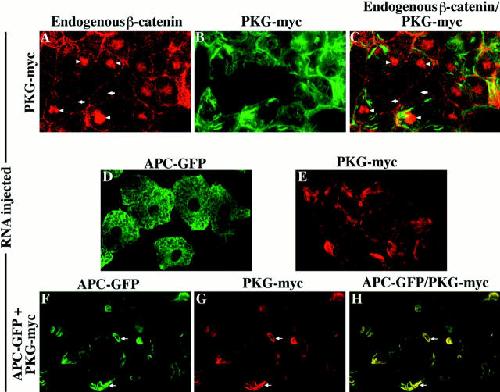 Figure 7. Overexpression of plakoglobin causes the accumulation of endogenous β-catenin in the nucleus and the redistribution of APCâGFP. Human plakoglobin was overexpressed in animal cap cells, and the distribution of both endogenous β-catenin (A and C) and myc-tagged plakoglobin (B and C) was determined by confocal microscopy. Cells expressing ectopic plakoglobin possess high levels of endogenous β-catenin in the nucleus (arrowheads in A and C) when compared to cells not expressing ectopic plakoglobin (arrows in A and C). Overexpression of plakoglobin also results in the redistribution of APCâGFP within the cell to sites of plakoglobin accumulation. The localization of APCâGFP (D) and ectopic plakoglobin (E) in the absence of other RNAs demonstrates the different localization patterns of the two ectopic proteins. Coinjecting APCâGFP and plakoglobin, however, results in the redistribution of APCâGFP (F) to a pattern indistinguishable from that seen for ectopic plakoglobin (G). Overlapping APCâGFP (F) and plakoglobin (G) staining appears as yellow staining in the merged image (H). Arrows mark examples of APCâGFP and plakoglobin colocalization.