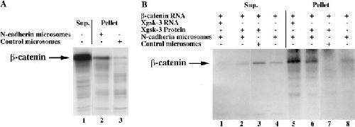 Figure 8. Phosphorylation of β-catenin by Xgsk-3 enhances association with N-cadherin in vitro. (A) β-catenin was translated in vitro in the presence of [35S]methionine and, in separate reactions, microsomal membranes were incubated in rabbit reticulocyte lysate with unlabeled methionine in the presence or absence of N-cadherin RNA. The β-catenin reactions and microsome reactions were then mixed, and the samples were incubated to allow binding of β-catenin to the microsomal membranes. The samples were then centrifuged to generate microsomal pellets and supernatants. Lane 1, 35Sâβ-catenin present in the supernatant after centrifugation. Adjusting for volumes, these lanes contain 40% of the total supernatant. Lane 2, 35Sâβ-catenin associated with the pelleted microsomes containing N-cadherin. Lane 3, 35Sâβ-catenin associated with control microsomes. The data show that a small percentage of the total 35S-labeled β-catenin binds microsomal membranes in a cadherin-dependent manner (compare lanes 1 and 2). (B) β-catenin and Xgsk-3 RNAs, as well as microsomal membranes with or without N-cadherin RNAs, were translated in vitro with nonradioactive methionine and then incubated with or without recombinant Xgsk-3 protein in the presence of [γ32P]ATP. After centrifugation, the samples were immunoprecipitated with an antiâβ-catenin antibody. Lanes 1 and 5, immunoprecipitation of β-catenin from the supernatant (lane 1) and microsome/N-cadherin pellet (lane 5) after cotranslation with Xgsk-3 RNA demonstrates that most of the phosphorylated β-catenin associates with the microsomal pellet. Lanes 2 and 6, immunoprecipitation of β-catenin from the supernatant (lane 2) and pellet (lane 6) of β-catenin translations incubated with recombinant Xgsk-3 protein confirms the conclusion of lanes 1 and 5. Lanes 3 and 7, omission of N-cadherin RNA demonstrates that most phosphorylated β-catenin is immunoprecipitated from the supernatant (lane 3) and not the microsomal pellet lacking N-cadherin (lane 7). Lanes 4 and 8, omission of exogenous Xgsk-3 protein and RNA demonstrates basal phosphorylation of β-catenin by kinases present in the lysate, that is substantially lower than in samples supplemented with Xgsk-3, and this phosphorylated β-catenin accumulates primarily in the supernatant (lane 4) rather than the pellet (lane 8), even though the microsomes contained N-cadherin.