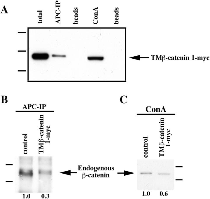 Figure 5. Ectopic TMâβ-catenin competes with endogenous β-catenin for binding to endogenous APC and a cadherin fraction. (A) Protein extracted from embryos injected with 1.25 ng of TMâβ-catenin 1-myc RNA was subjected to APC immunoprecipitation (APC-IP) or ConA precipitation (ConA, represents cadherin-bound fraction) followed by immunoblotting with anti-myc antibodies. Control lysates were incubated with beads alone (beads). These experiments show that TMâβ-catenin 1-myc binds endogenous APC and is present in ConA-bound fractions, indicating an association with cadherin. (B) To determine the effect of overexpression of TMâβ-catenin 1-myc on the levels of endogenous β-catenin associated with APC, protein extracts from control embryos or embryos injected with 1.25 ng TMâβ-catenin 1-myc were subjected to immunoprecipitation with anti-APC antibodies followed by immunoblotting with antiâβ-catenin antibodies. These analyses show that overexpression of TMâβ-catenin 1-myc causes a decrease relative to controls in the levels of endogenous β-catenin associated with APC. (Relative levels of endogenous β-catenin are shown below each lane with controls set to 1.0.) (C) Changes in the levels of endogenous β-catenin associated with a cadherin fraction were examined by preparing ConA precipitates from protein extracts prepared from control or TMâβ-catenin 1-myc RNAâinjected embryos followed by immunoblotting with antiâβ-catenin antibodies. The levels of endogenous β-catenin present in ConA fractions decreased to 0.6 of control levels, suggesting that ectopic TMâβ-catenin competes with endogenous β-catenin for binding to cadherin. (Relative levels of endogenous β-catenin are shown below each lane.) Molecular mass markers indicated in A are 198, 113, and 75 kD and those indicated in B and C are 113 and 75 kD.