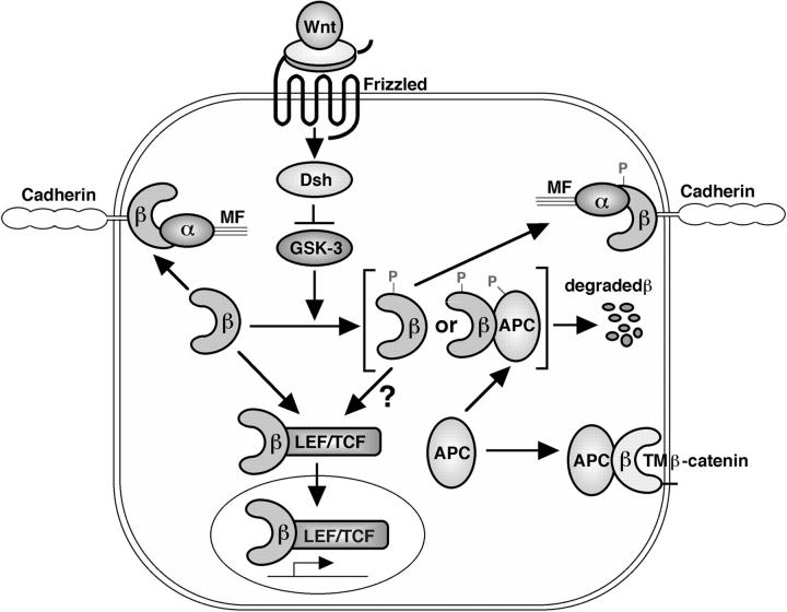 Figure 9. Model of the Wnt signaling pathway showing competition between endogenous and ectopic β-catenin for interactions with several protein partners, including cadherin, APC, and Lef/ Tcf. Overexpression of various β-catenin mutants that possess the ability to interact with APC (TMâβ-catenin is shown) is predicted to increase the stability of endogenous β-catenin. The accumulation of endogenous β-catenin via activation of the Wnt pathway or expression of ectopic β-catenin both result in the increase of âfreeâ β-catenin capable of interacting with members of the Lef/Tcf family of transcription factors. This β-catenin transcription factor complex translocates into the nucleus, where it regulates the expression of target genes responsible for establishing dorsal cell fate. Furthermore, phosphorylation of β-catenin by XGSK-3 may not only regulate β-catenin stability but may also result in competition between phosphorylated and nonphosphorylated β-catenin isoforms for binding to the cytoplasmic domain of cadherin.