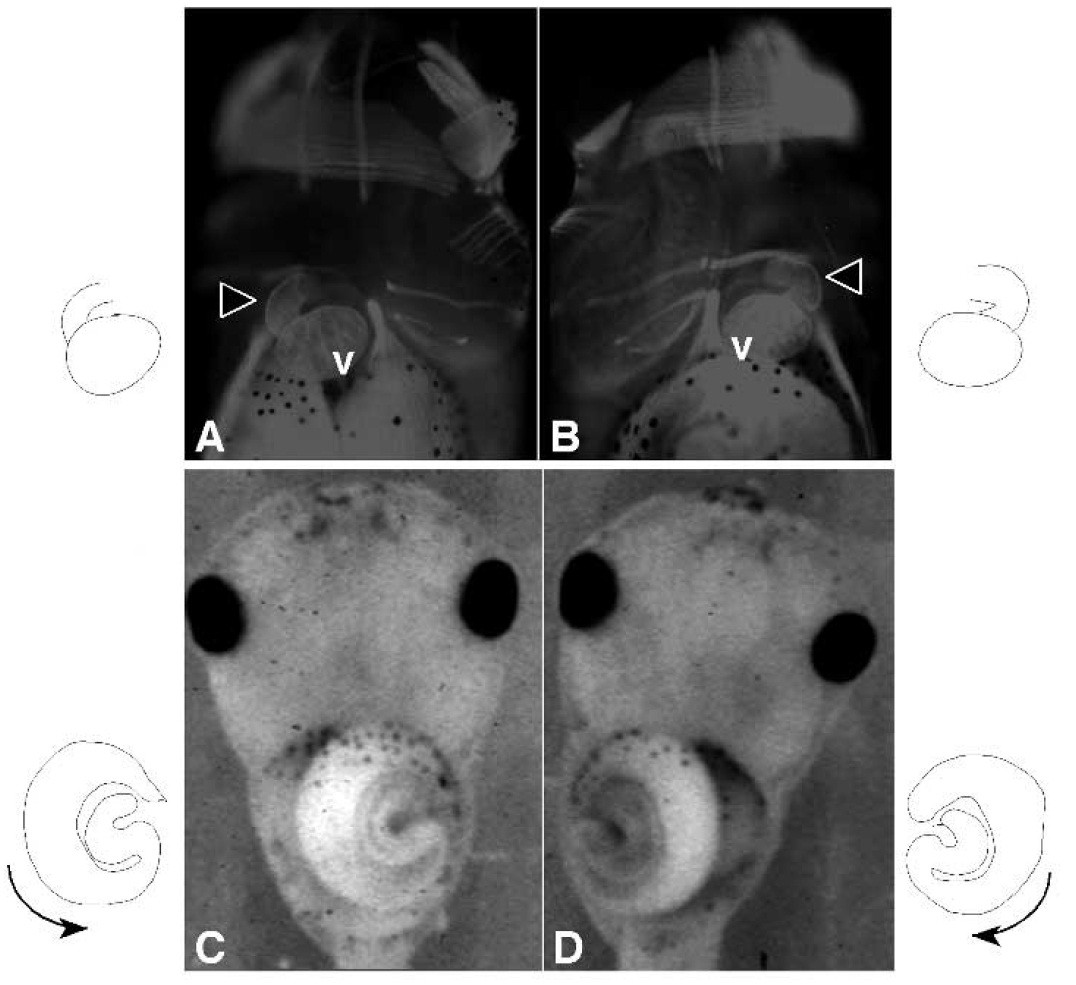(C) normal looping, (D) reversed looping. Arrows indicate the direction of looping on the outline
