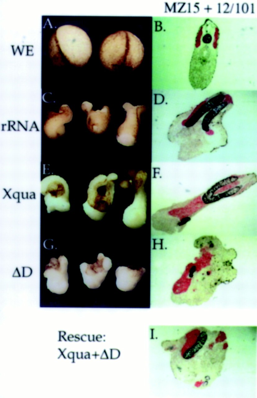 Figure 9. âOverexpression of the pXqua mutant δD inhibits notochord differentiation. rRNA (2.5 ng), Xqua, or δD mRNA was injected into each of the two dorsal blastomeres at the four-cell stage. Dorsal mesoderm explants containing presumptive notochord and somite tissue were dissected from injected embryos at early gastrula (stage 10â10.5) and cultured in isolation to examine notochord differentiation directly. (A,C,E,G) External morphology of the explants is shown when sibling embryos (WE) reached early neurula stage. (B,D,F,H,I). At later tailbud stage, explants were fixed, sectioned, and immunostained with MZ15 for notochord (black) and 12/101 for somite (red). From a total of 12 explant experiments, a section through a typical explant is presented. (C) Control rRNA explants exhibit considerable elongation resulting from convergent extention movements of the developing notochord, and (D) immunostaining of control explants shows a substantial amount of notochord and somite tissue. (E)Xqua overexpressing explants exhibit more dramatic morphological elongation and (F) contain moderately more notochord and somite tissue than controls (cf. amount of unstained tissue to that in D). (G) Explants overexpressing δD exhibit very little morphological elongation compared with controls (cf. to C) and (H) show dramatically less notochord tissue but little change in the amount of somite tissue. (I) Inhibition of notochord differentiation owing to δD overexpression is rescued by coinjection of an equal amount of synthetic Xqua mRNA (5 ng of δDâ+â5 ng ofXqua) (cf. amount of notochord in I to H andD), indicating that the biological effects of δD overexpression are specific to the Xqua pathway. |