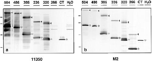 Figure 2. Western blot analysis of Xenopus oocytes injected with mRNAs corresponding to the occludin proteins diagrammed in Fig. 1. mRNAs were microinjected in the vegetal hemisphere of stage VI oocytes, and the injected oocytes were incubated at 17°C overnight. Oocyte homogenates were separated on 12% SDS-PAGE, transferred to Immobilon membranes, and then immunoblotted with either anti-occludin antibody 11350 (a) or with anti-FLAG monoclonal antibody M2 (b). The number on the top of each lane identifies each protein as named in Fig. 1. The asterisks in a and b indicate the predicted position of each expressed protein. With the exception of the soluble CT, the expressed proteins formed dimers as indicated by the arrowheads. Note that protein 266, with almost the entire COOH terminus deleted, was not recognized by 11350 antibody. H2O, control oocytes injected with water. Molecular weight markers (from top to bottom): 97.4, 66, 45, and 31 kD.