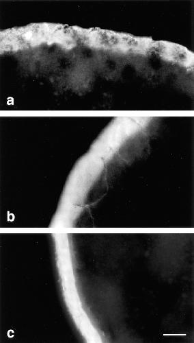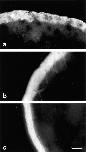 Figure 4. Coinjection of the full-length (504) occludin mRNA with the most COOH-terminally truncated occludin mRNA (266) rescued the tight junction leakage caused by injection of construct 266 alone. The experimental procedure was same as in Fig. 3. The frozen sections from the embryos injected with ∼2 pg of 504 (a), 266 (b), or 504 and 266 (c) construct mRNA were stained with RITC-avidin. The extraembryonic space is toward the top of figure in a, and left in b and c. No leak was seen in the embryo infected with 504 mRNA (a). Biotin molecules clearly penetrated through the tight junctions and labeled the intercellular spaces between the apical cells of embryo injected with 266 mRNA (b). However, there was no detectable leak in the embryo injected with both 504 and 266 mRNA (c). Bar, 15 μm.