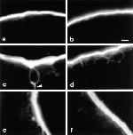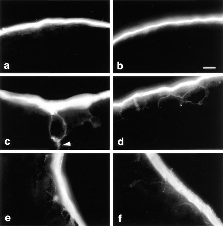Figure 3. Functional assay of tight junctions by surface biotinylation in Xenopus embryos injected with chicken full-length or truncated occludins. 6 h after mRNA injection (2,000 cell blastula), the embryos were labeled by incubation in 1 mg/ml NHS-LC-biotin for 12 min at 10°C, washed, and then fixed in 3% formaldehyde in 80 mM sodium cacodylate. Frozen sections were stained with RITC- avidin and observed by fluorescence microscopy. In all embryos, NHS-LC-biotin reacts with molecules in the vitelline envelope, the subvitelline space, and the apical plasma membranes of the blastomeres, which together appear as a thick, continuous line at the surface of the embryo. The tight junctions in the embryos injected with 504 (a, the full-length) or 486 (b, the least COOH-terminally truncated) occludin mRNAs deny the biotin access to the intercellular spaces, and the basolateral membranes of the blastomeres are not stained. In the embryos injected with 385 (c), 336 (d) 320 (e), and 266 (f) (four COOH-terminally truncated occludin mRNAs), the biotin molecules penetrated into intercellular spaces demonstrating the disruption of the tight junction seal. Bar, 10 μm.