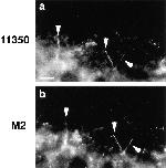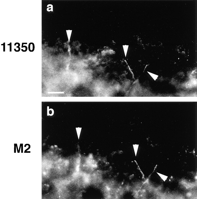 Figure 5. Double labeling of frozen sections of Xenopus embryos with anti-occludin 11350 (a) and anti-FLAG M2 (b). 4 nl (∼10 pg) of mutant 266 mRNA were microinjected into the anterior, dorsal blastomere of eight-cell stage embryo and incubated for 8 h at room temperature before freezing. The arrowheads indicate the colocalization of Xenopus full-length occludin and chicken truncated occludin at the junctional complexes. Bar, 10 μm.
