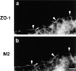 Figure 6. Immunocolocalization of Xenopus ZO-1 with the protein directed by mutant 266, the most truncated occludin in Xenopus embryos. Frozen sections were made of embryos injected with mutant 266 mRNA and stained with either anti–ZO-1 (a) or with anti-FLAG M2 (b). The arrowheads indicate the colocalization of both proteins at the junctional complexes. Bar, 10 μm.
