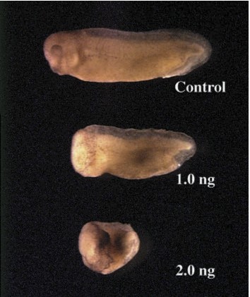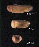 Fig. 5. msx1 ventralizes Xenopus embryos. msx1 RNA (1.0 or 2.0 ng) was injected into the animal pole of 2-cell embryos which were grown to tadpole stages (stage 31). The uninjected embryo is used as a control.
