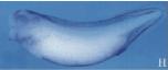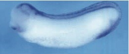 msx1 (msh homeobox 1) gene expression in Xenopus laevis embryo via in situ hybridization, NF stage 11, lateral view, anterior up, dorsal right.