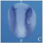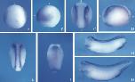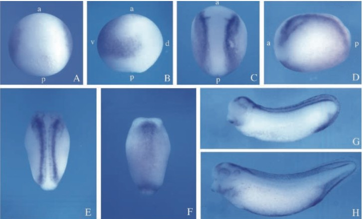 Fig. 3. Spatial distribution of msx1 transcripts during early Xenopus development. Whole-mount in situ hybridization of albino embryos using a digoxigenin-labeled antisense msx1 probe. msx1 transcripts are detectable from midgastrula stages (stage 11; A,B). Dorsal (A) and lateral (B) views indicate the localization of msx1 transcripts in the ventral animal and marginal regions of the embryo. Dorsal (C) and lateral (D) views at early neurula stages indicate that the expression of msx1 gradually divides into ventral and dorsal regions, and that the dorsal expression is restricted to the border of epidermis and neural plate. a, anterior; p, posterior; d, dorsal; v, ventral. (E,F) Dorsal and ventral views of stage 17 embryos, respectively, and anterior is up. As the neural tube closes, the expression of msx1 is observed in the dorsal neural tube (E) and the heart and around blastopore on the ventral side (F). At tailbud (G) and tadpole (H) stages, expression is detected in fin, cement gland, dorsal neural tube, otic vesicle and, broadly, in the ventral region.