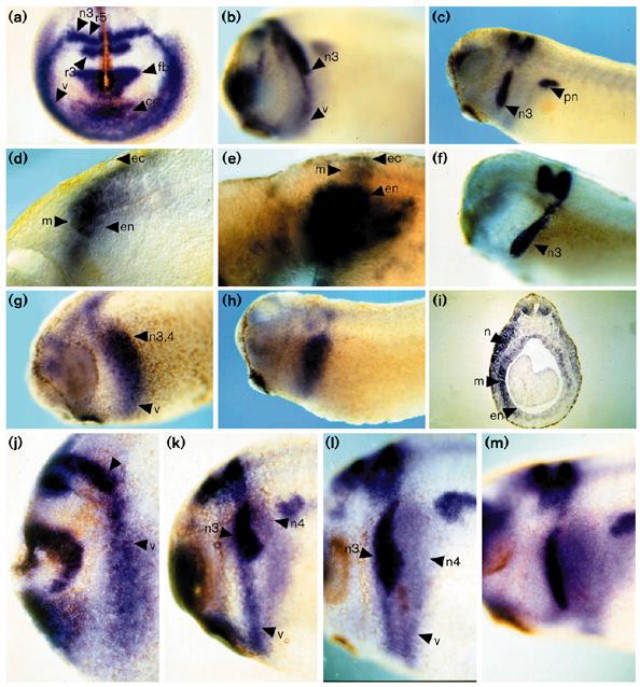 Figure 2. Expression of EphA4 and EphB1 in the branchial region. Whole-mount in situ hybridisation was carried out to detect EphA4 and EphB1 expression during branchial neural crest migration. (aâe) Expression pattern of EphA4. (a) A stage 19 embryo shown in dorsalârostral view. Note the ventral domain of EphA4 expression in the presumptive branchial arch region coextensive with the EphA4-expressing neural crest. (b) A stage 23 embryo show in lateral view. EphA4-expressing neural crest has started to migrate, and the ventral domain has narrowed to a stripe at the rostral margin of the third arch. (c) A stage 26 embryo shown in lateral view. EphA4-expressing neural crest has migrated into the third branchial arch. (d) Coronal section through the ventral domain of EphA4 expression in the presumptive branchial arch region of a stage 19 embryo. Expression occurs in visceral mesoderm, and at lower levels in underlying endoderm. (e) Coronal section through ventralEphA4 expression domain in a stage 23 embryo. Expression is at low levels in visceral mesoderm, and at higher levels in a broader domain in the underlying endoderm. (f) Krox-20 gene expression in a stage 26 embryo. Expression in neural crest is restricted to the third branchial arch. (gâi) Expression pattern of EphB1. (g) At stage 25, EphB1 expression occurs in migrating third and fourth arch neural crest, and thus appears as a broader domain than EphA4. Expression also occurs in a ventral domain coextensive with the neural crest; the border of the neural crest is difficult to see because expression occurs at similar levels in the ventral region. (h) At stage 27, expression occurs in the fourth and more caudal branchial arches. (i) Section through stage 25 embryo. Expression is detected in neural crest, visceral mesoderm and endoderm. (j) Lateral view of EphA4 expression at stage 19 (see (a)), showing the ventralEphA4 expression domain in more detail. (kâm) Detection of EphA4 (strong staining in neural crest) plus EphB1 (weaker staining) expression during neural crest migration at stages 23 (k), 24 (l) and 26 (m). EphB1 expression extends caudal to EphA4 expression both in third arch neural crest and in the ventral domain. Abbreviations: r3/5, rhombomeres 3/5; n3/4, neural crest destined for third/fourth arch; v, ventral expression domain; fb, forebrain; cg, cement gland; pn, pronephros; ec, ectoderm; m, mesoderm; en, endoderm.