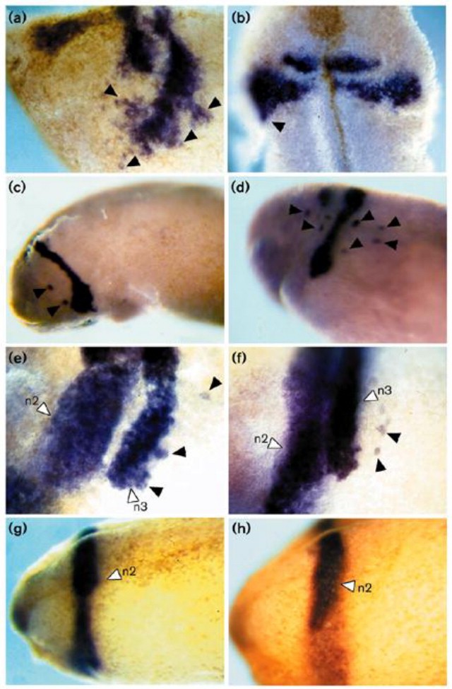 Figure 5. Effects of overexpressing ephrin-B2 on neural crest migration. RNA encoding ephrin-B2 was injected into Xenopus embryos at the two-cell stage, which were later fixed and in situ hybridisation carried out to detect second and third arch neural crest markers. (a,b) Embryos fixed at stage 20 and analysed with a Krox-20 probe. (c,d) Embryos fixed at stage 24 and analysed with a Krox-20 probe. (e,f) Embryos fixed at stage 20 and analysed with Krox-20 plus EphA2 probes. (g,h) Embryos fixed at stage 24 and analysed with an EphA2 probe. Ectopic Krox-20-expressing cells (black arrows) are detected caudal and/or rostral to the third arch neural crest stream (n3), which is often abnormal in shape. In contrast, the second arch crest (n2) marked by EphA2 expression appears normal. In some embryos (e), there was a gap between the third and second arch neural crest which could reflect a narrower stream of third arch crest cells.