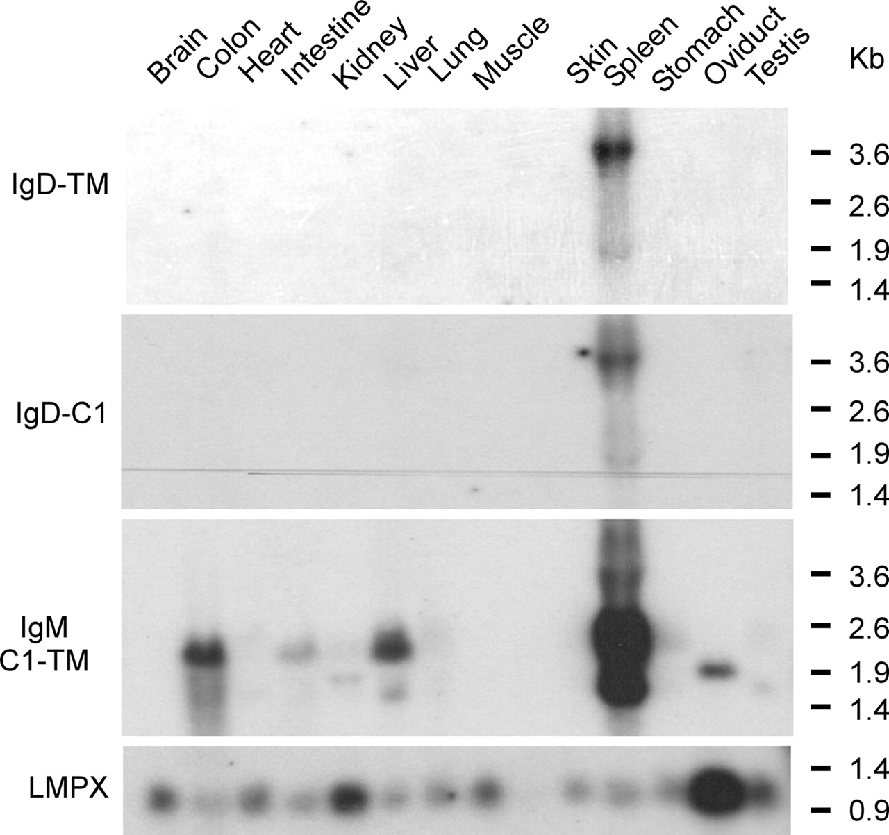 Fig. 4. Xenopus IgD is expressed predominantly in the spleen. Twenty micrograms of total RNA from various tissues of an X. tropicalis frog was loaded on the gel, and the Northern blot was hybridized with X. tropicalis δC1 and TM probes separately. An X. tropicalis μ C1-TM probe was also used to compare the level of expression and tissue distribution. Two bands detected with the μ probe account for the different 3â²-UTR lengths between secretory and TM forms or unknown splice variants specific to this species. Ubiquitously expressed LMPX was used as the loading control. Although the loading amounts are not equal on this blot, IgD is found only in the spleen, despite the fact that less spleen RNA was loaded. RNA size markers are shown on the right.