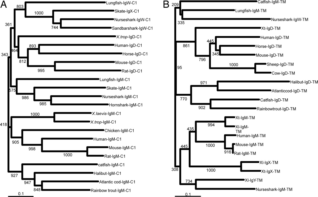 Fig. 6. Phylogenetic relationship of Xenopus IgD to IgD and IgW from other species. Neighbor-joining bootstrapping trees (1,000 runs) of C1 (A) and TM (B) domains were made. Gaps were included, and multiple substitutions were not taken into account. The scales show the genetic distances. The scale shown as a bar represents the genetic distance (i.e., number of amino acid changes in the given scale). GenBank accession nos. for each sequence are as follows: Human-IgD (AAH21276), Mouse-IgD (AAB59654), Rat-IgD (AAO19643), Horse-IgD (AAU09793; ref. 44), Lungfish-IgW (AAO52811), Sandbar shark-IgW (AAB03680), Nurse shark-IgW (AAB08972), Skate-IgX (AAA49546), Catfish-IgD (AAC60133), Halibut-IgD (BAB41204), Atlantic Cod-IgD (AAF72566), Rainbow trout-IgD (AAW66976), Human-IgM (AAH11857), Mouse-IgM (AAH18315), Rat-IgM (AAH92582), Chicken-IgM (P01875), X. laevis-IgM (AAA49774), X. tropicalis-IgM (AAH89679), Lungfish-IgM (AAO52808), Nurse shark-IgM (AAA50817), Horn shark-IgM (P23085), and Skate-IgM (AAA49547).
