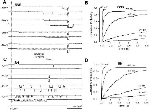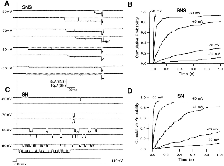 Figure 4. First latencies of SN and SNS single-channel currents. (A and C) Representative traces at various depolarizations in single-channel patches from oocyte expressing SNS (A) or SN (C). The dotted line marks the beginning of the depolarizations. (B and D). The cumulative first-latency distributions are plotted for SNS (B) and SN (D) at the potentials indicated. First latencies were measured as the time to first opening, to either sub- or main conductance level. |