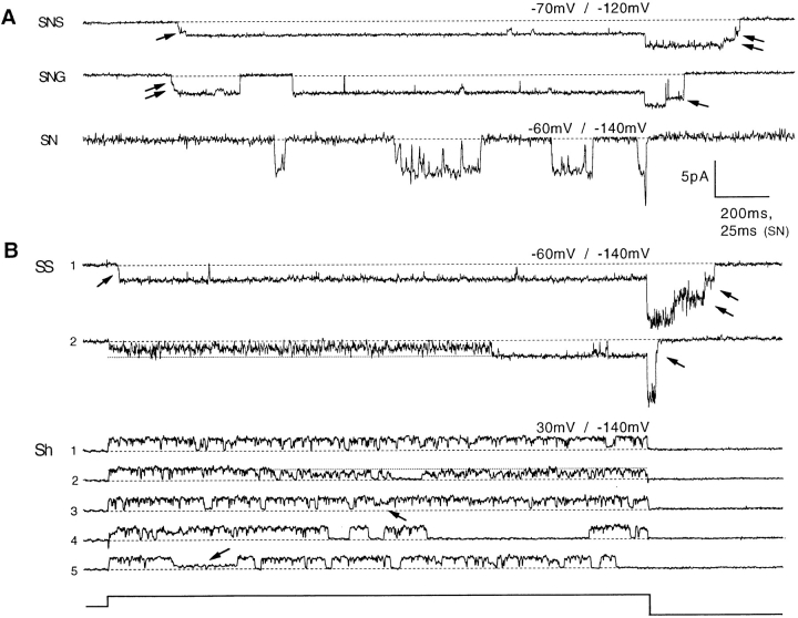 Figure 3. Single-channel currents from five channel types, recorded in inside-out patches. (A) Representative single- chan-nel current traces of the SN channel and its derivatives. Potassium ion concentration was 140 mM on each side of the membrane. Channels were activated by a depolarization from a −100-mV holding potential to −60 mV (SN) or −70 mV (SNS and SNG). The tail potential was −140 mV (SN) or −120 mV (SNS and SNG). Note the different time scale for the SN current, which also has a larger single-channel conductance. Some dwells in subconductance levels are indicated by arrows. (B) Single-channel currents of Shaker and its derivative SS. Two selected sweeps recorded in symmetrical 140 mM K+ show the “nonbursting” and “bursting” behaviors of SS. The first sweep contains a brief dwell at a sublevel during activation (arrow) as well as a clear “staircase” of conductances during deactivation. Also shown are five successive sweeps from a truncated Shaker B channel, recorded with 5 mM external K+. Some dwells at subconductance levels are indicated by arrows. For the recording from the NH2-terminal–truncated Shaker B channel, the pipette solution contained 5 mM K-aspartate, 135 mM NMDG-aspartate, 1.8 mM CaCl2, and 10 mM Hepes. All recordings were filtered at 1 kHz. The recordings of SN and SS currents used uncoated patch pipettes, which yielded larger background noise. |
