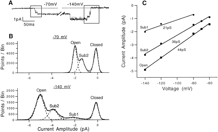 Figure 5. Amplitudes of the three current levels in SNS channels. (A) Representative current trace showing channel activation at −70 mV and deactivation at −140 mV. Boxes indicate regions of this trace used in constructing the amplitude histograms. (B) Amplitude histograms of the single- channel current at the two voltages, accumulated from portions of 380 sweeps as in A. Filter bandwidth was 1 kHz. Superimposed are fits of three (−70 mV) or four (−140 mV) Gaussian functions; the midpoint of each Gaussian is taken to be the mean current amplitude. The standard deviations (in pA) of the Gaussian components are as follows. For −70 mV: 0.25 (closed), 0.36 (sub2), 0.25 (open); for −140 mV: 0.30 (closed), 1.0 (sub1), 0.54 (sub2), 0.50 (open). (C) The mean current amplitudes at different voltages. The superimposed linear fits yield the slope conductances shown. |