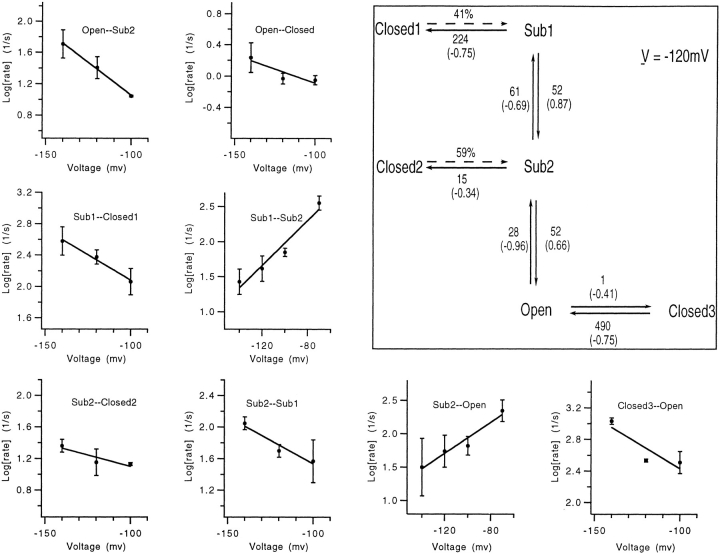 Figure 9. Voltage dependence of transition rates. Rate constants were computed as described in Methods from single-channel activation time courses at −70 mV (n = 3 patches) and deactivation time courses at −100 (n = 2), −120 (n = 4), and −140 mV (n = 3). Superimposed on each plot is an exponential fit of the voltage dependence. The kinetic scheme (inset) summarizes the measurements from both activation and deactivation. Values for the rate constants (in s−1) are given for V = −120 mV. The partial valence associated with each rate constant is given in parentheses. |