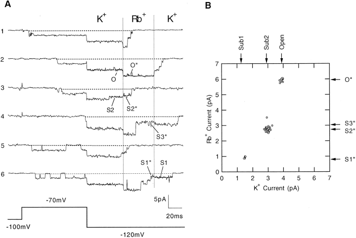 Figure 11. Solution switching experiment. (A) In an outside- out patch, the channel is activated by a depolarization to −70 mV from the −100-mV holding potential. Switching of the external solution occurs during the tail current at −120 mV, as shown by the dotted lines. In traces 1, 2, and 4, the K+ → Rb+ switching occurs while the channel is at the open level; in traces 3 and 5, it occurs while the channel is at sub2 sublevel. Trace 4 shows Rb+ → K+ switching while the channel is at sub2. Trace 6 shows Rb+ → K+ switching while the channel is at sub1. The pipette solution contained 130 mM K-aspartate, 10 mM KCl, 1 mM EGTA, 10 mM Hepes, and the bath solution contained 140 mM K-aspartate, 1.8 mM CaCl2, 10 mM Hepes; each was adjusted to pH 7.3. (B) Scatter plot of mean current values obtained before and after solution switching. Mean current was calculated only from the traces in which the current levels were stable for at least 5 ms both before and after the solution switching. |