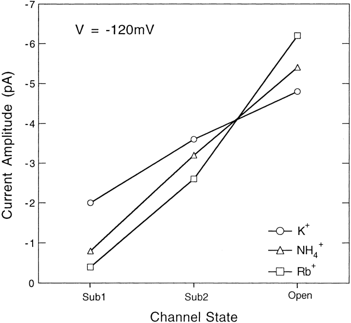 Figure 12. Amplitudes of each current level in SNS channels at −120 mV when K+, NH4+, or Rb+ is the external ion. |