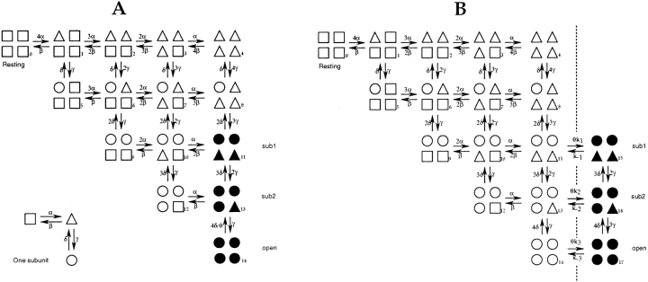 Figure 13. Two speculative gating schemes. (A) The scheme of Zagotta et al. (1994b) is shown, in which a single subunit undergoes two voltage-dependent conformational transitions (inset) to reach a permissive state (circles). Subunit transitions occur independently, with the exception of a slowed transition from the open state 14 to state 13. The scheme has been modified to identify sublevels sub1 and sub2 with states in which two or three subunits are in the permissive state. (B) The scheme Is modified to include a distinct allosteric transition (dotted line) that follows activation of the subunits. The allosteric transition is assumed to be very rapid and switches between fully conducting and nonconducting states. Allosteric equilibria are influenced by a common factor θ that is greatly increased by the T442S mutation. In both schemes, the conducting states are represented by filled symbols. |