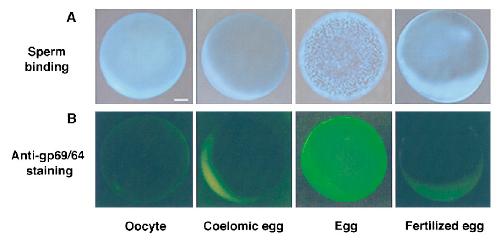 egg (1.2â1.3 mm in diameter), not all of the sperm are in focus. Bar, 0.2 mm. (B) Fluorescence micrographs showing polyclonal anti-gp69/