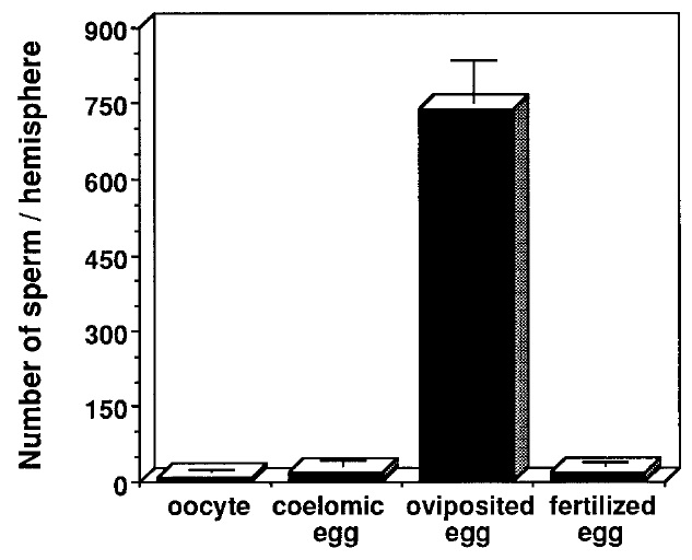 FIG. 1. Measurement of the number of sperm bound to one hemi-sphere of an oocyte, coelomic egg, dejellied oviposited egg, or dejel-lied fertilized egg (0.5 hr after fertilization). The number of bound sperm per hemisphere was determined by focusing stepwise through the depth of the top half of the egg, and counting sperm heads. (For details of the assay see Tian et al., 1997.) Bars indicate the standard deviation (SD) with n 15 eggs.
