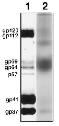 FIG. 5. 125I surface labeling profile of the glycoproteins in the intact VE. Lane 1, VE proteins separated by 7.5% SDS–PAGE and stained with Coomassie blue. The proteins are identified on the left. Lane 2, autoradiograph of radioiodinated VE surface proteins. A minor contaminating band below gp112 (not visible in Coomassie blue-stained gel) was also labeled.