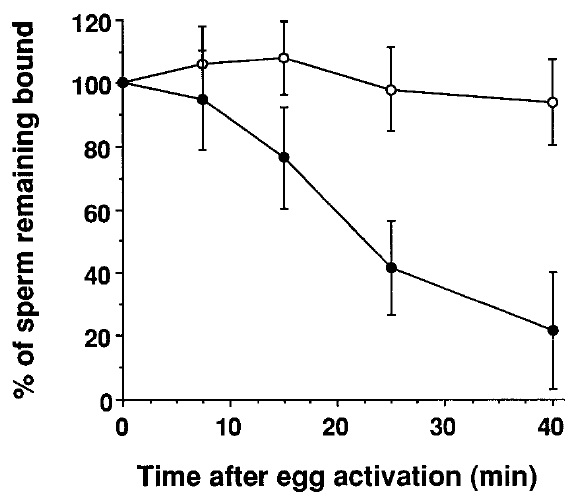 FIG. 7. Kinetics of detachment of sperm from dejellied eggs after