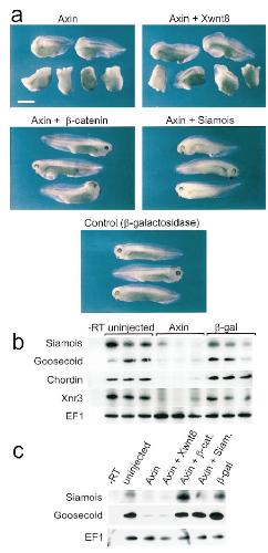 (b) Dorsal injection of Axin reduces expression of dorsal markers Siamois, Goosecoid, Chordin, and Xnr3, but not the ubiquitously expressed elongation factor EF1. Each column shows the RT-PCR analysis of a pool of uninjected embryos or embryos injected at the 4-cell stage with Axin or control β-gal mRNA (2 ng), and grown to early gastrulae. âRT, control experiments in which RNA from uninjected embryos was processed without reverse transcriptase.