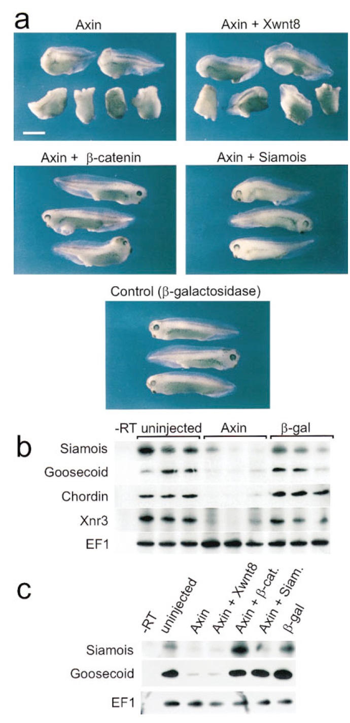 (c) Dorsal coinjection of β-catenin with Axin restores expression of Siamois and Goosecoid, and coinjection of Siamois restores Goosecoid expression, while coinjection of Xwnt8 has no effect. Note that the injected Siamois (not detected with the primers used in this assay) does not induce expression of endogenous Siamois.