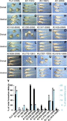 Fig. 8. Both the leucine zipper-like regions (LZL) and the putative PDZ-domain-binding motif are required for xDal function. (AâX) A single ventral blastomere or both dorsal blastomeres of four-cell embryos were injected with mRNA (1 ng). Dorsal or ventral injection of xDal deletion-mutant mRNA: #(1â1151), #(1â1601), #(1â2054), #(1230â2058), #(1347â2058), #(1425â2058), #(1639â2058), or #(δ1015â1559), did not induce partial secondary axes or gastrulation-defective phenotypes. The other deletion mutants, which had greater than one LZL and a putative PDZ-domain-binding motif; #(1152â2058), #(1230â2058), #(δ771â1261), and #(δ1301â1559) had xDal activity. (Y) The above experiments are summarized in the graph. Black and gray bars indicate the frequency of axial formation defects. The black bars indicate severely deformed phenotypes that have open blastopores. The gray bars show mildly deformed phenotypes that have a shorter axis. Blue bars indicate the frequency of partial secondary axis formation. |