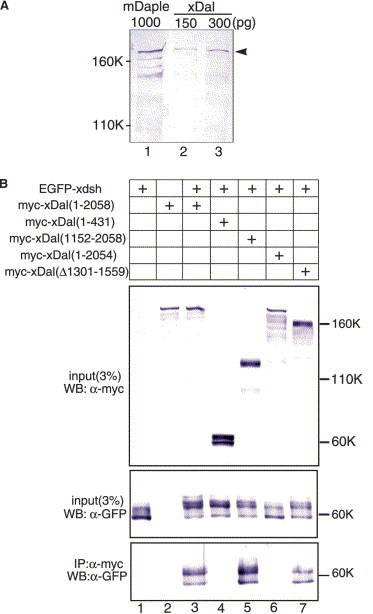 Fig. 2. Direct interaction of xDal with xdsh. (A) mycâmDaple (1000 pg; lane 1), 150 pg of mycâxDal #(1â2058) (150 pg; lane 2, 300 pg; lane 3) were injected into embryos and the protein expression was checked by western blotting with an anti-myc antibody. (B) Immunoprecipitation assays were carried out with full-length xDal and several deletion mutants. mRNAs of EGFP-dsh (500 pg; lane 1), mycâxDal #(1â2058) (1 ng; lane 2), EGFP-dsh and mycâxDal #(1â2058) (lane 3), EGFP-dsh and mycâxDal #(1â431) (500 pg; lane 4), EGFP-dsh and mycâxDal #(1152â2058) (500 pg; lane 5), EGFP-dsh and mycâxDal #(1â2054) (1 ng; lane 6), or EGFP-dsh and mycâxDal #(δ1301â1559) (1 ng; lane 7) were injected into the animal pole of two-cell stage embryos. Injected embryos were harvested at stage 12. Whole-embryo lysates were prepared and 3% were analyzed by western blotting with anti-myc (upper column) or anti-GFP (middle column) antibody. The remainder of the lysates were immunoprecipitated with anti-myc antibody and blotted with anti-GFP antibody (lower column). Positive signal was detected following injection with mycâxDal #(1â2058), mycâxDal #(1152â2058) and mycâxDal #(δ1301â1559). |