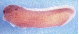 ccdc88c (coiled-coil domain containing 88C)gene expression in Xenopus laevis embryo, assayed via in situ hybridization, NF stage 28, lateral view, anterior left, dorsal up. |