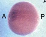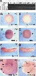 Fig. 3. XDal is expressed during Xenopus embryogenesis. (A) RT-PCR analysis of xDal during Xenopus development. Stages are according to Nieukoop and Faber (1967). XDal was expressed maternally, and its expression began to increase at the two-day tadpole stage. UF, unfertilized egg; ODC, ornithine decalboxyrase. RT(-) indicates the RT-PCR without reverse transcription reaction. (Bâ I) Whole-mount in situ hybridization analysis of xDal. (B), (D), (F), (H), and (I) show the results with the antisense probe (AS), whereas (C), (E), and (G) show the results with the sense probe (S) for negative controls. (B, C) Gastrula (Stage 10.5, vegetal view; dorsal is top), (D, E) neurula (Stage 15, dorsal view; anterior is left), (F, G) late tailbud (Stage 30, lateral view; anterior is left), (H) magnified image of the anterior view of neurula. Arrowhead shows intense expression of xDal at the presumptive midbrain region, whereas a square rectangle shows a presumptive forebrain. (I) A magnified image of the head region of tadpole. Several neural tissues express xDal. EV, eye vesicle; OP, olfactory placode; OV, otic vesicle; PP, pharyngeal pouch. D, dorsal; V, ventral; A, anterior; P, posterior. |