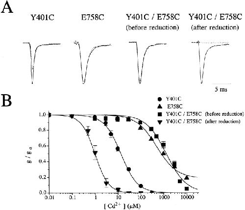 Replacement of individual P-loop residues with cysteines in rat skeletal muscle Na+ channels (SkM1) caused an increased sensitivity to current blockade by Cd2+ thus allowing detection of residues lining the pore. Simultaneous replacement of two residues in distinct P-loops created channels with enhanced and reduced sensitivity to Cd2+ block relative to the individual single mutants, suggesting coordinated Cd2+ binding and cross-linking by the inserted sulfhydryl pairs. Double-mutant channels with reduced sensitivity to Cd2+ block showed enhanced sensitivity after the application of sulfhydryl reducing agents. These results allow identification of residue pairs capable of approaching one another to within less than 3.5 A. We often observed that multiple consecutive adjacent residues in one P-loop could coordinately bind Cd2+ with a single residue in another P-loop. These results suggest that, on the time-scale of Cd2+ binding to mutant Na+ channels, P-loops show a high degree of flexibility.