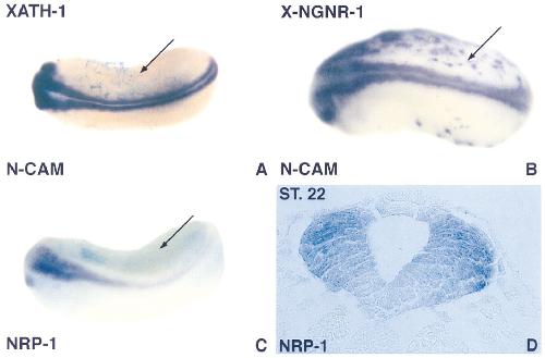 1. In (D) the nrp-1 expression domain is shown at Stage 22 in a cross section from the hindbrain region of a normal embryo.