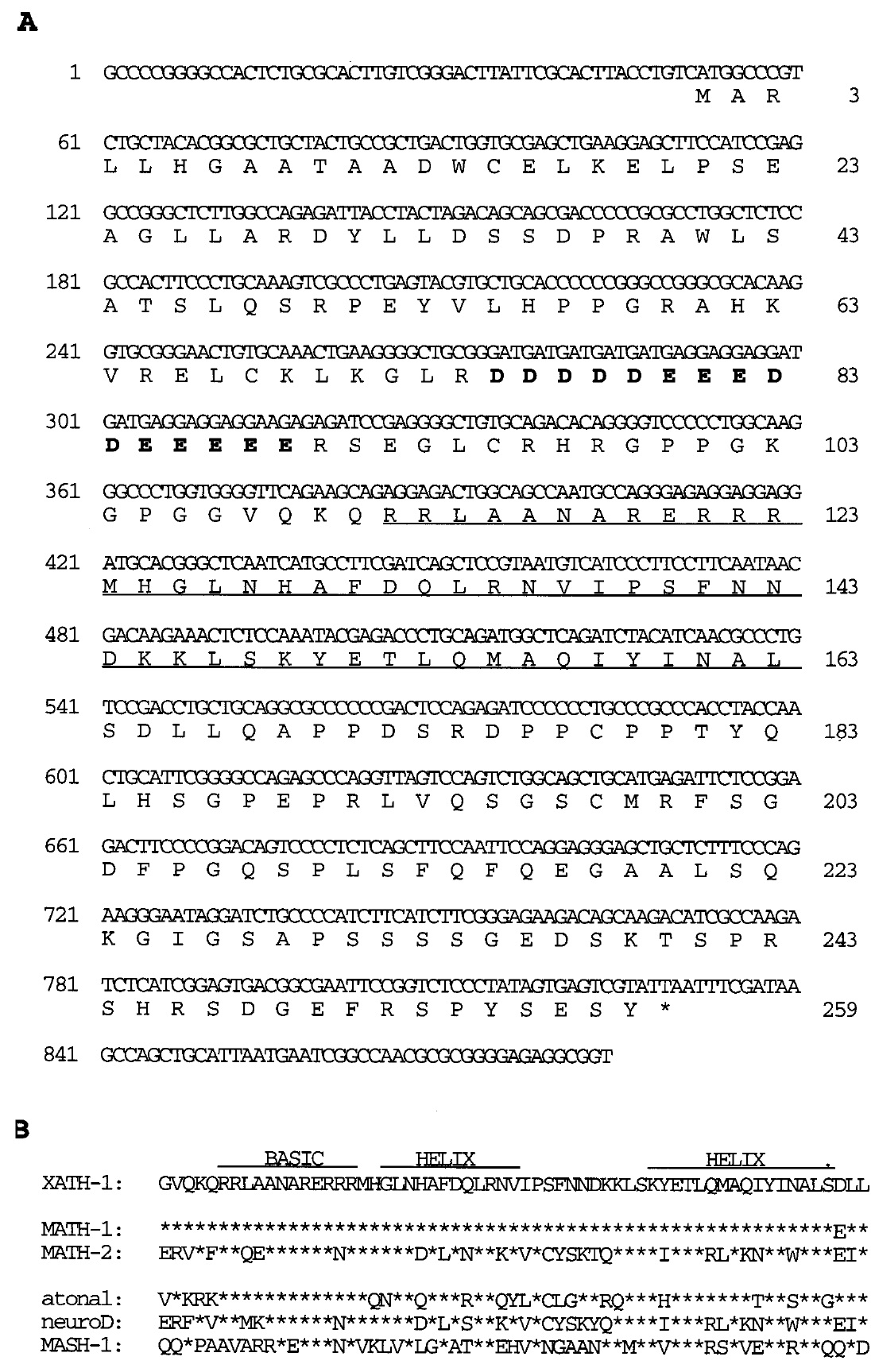from sequence analysis of a XATH-1 genomic clone. The bHLH region is underlined. An upstream acidic rich region with homology to