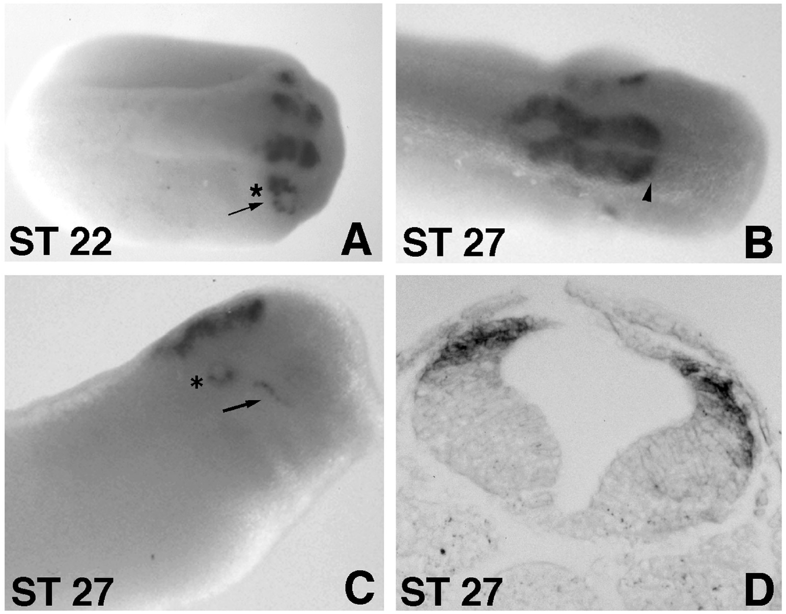 indicated by an asterisk and expression in the trigeminal ganglia is indicated by an arrow (A and C). A cross section of a Stage 27 embryo