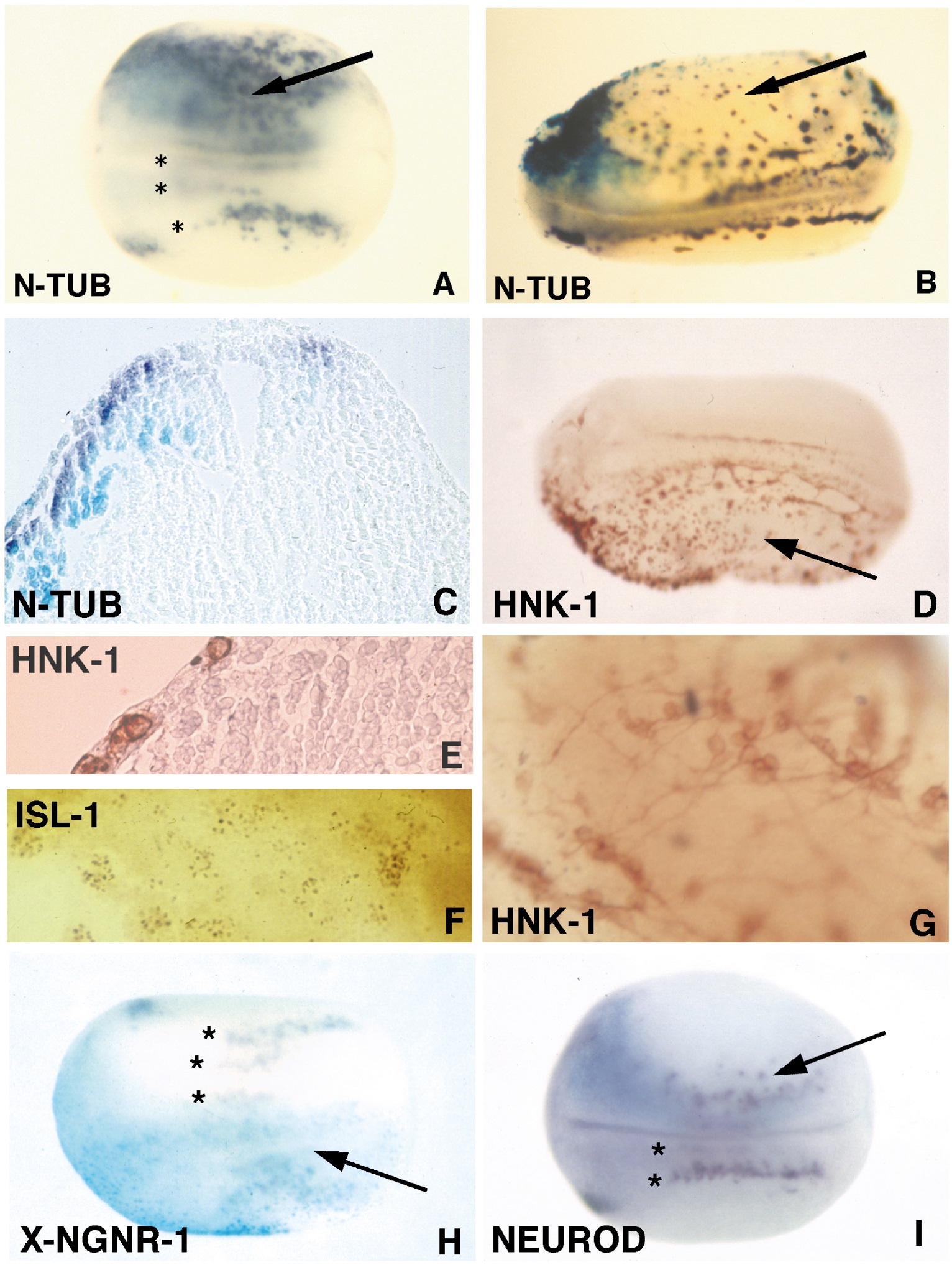 the epidermis of Stage 27 embryo. Neurons are stained for HNK-1. (H) X-NGNR-1, Stage 14. (I) neuroD, stage 16.
