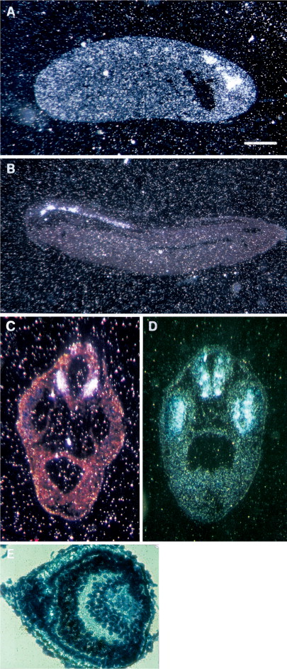 Fig. 4. Spatial expression of X5-HT1A transcripts in Xenopus development as detected by in situ hybridization. Dark-field photomicrographs showing X5-HT1A mRNA distribution on sagittal (A,B) and transverse (C,D) sections. In a stage-22 embryo, the autoradiographic signal is detectable in the rostral part of the brain stem (A); in a stage-31 embryo the labeling extends from the anteriormesencephalon to the posterior end of rhomboencephalon (B); in a stage-29 embryo the label is simmetrically located in a ventro lateral position of the mesencephalon on either side of the midline (C); (D) transversal section of a stage-41 embryo at the rostral mesencephalic level, including hypothalamus. Two pairs of autoradiographic grain clusters are visible in the brain: the more dorsal one is in correspondence of ventralmesencephalon, the other is in correspondence of hypotalamus; a strong signal is present on the inner nuclear layer (INL) of the retina. (E) Bright-field photomicrograph of a section through the eye showing that the INL of the retina appears labeled also at an older stage (44) of development. Scale bars=255 μm (in A); =400 μm (in B); =160 μm (in C,D); =20 μm (in E).