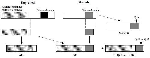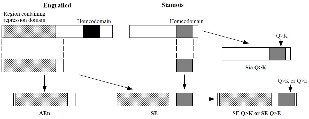 engrailed part of the fusion. The constructs SEQ>K and SEQ>E contain a glutamine-to-lysine (Q>K) or