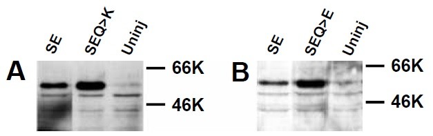 stage with (A) 5 pg of SE or 5 pg of SEQ>K mRNA, and (B) 10 pg