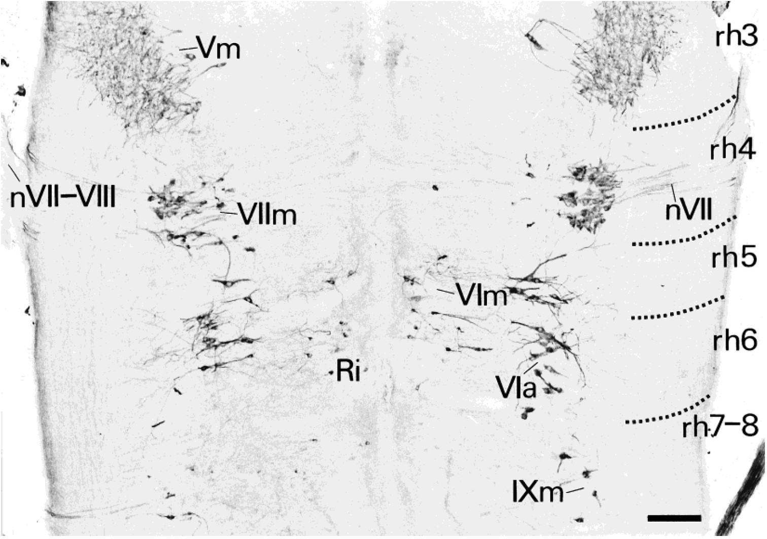 Because our knowledge of cholinergic systems in the brains of amphibians is limited, the present study aimed to provide detailed information on the distribution of cholinergic cell bodies and fibers as revealed by immunohistochemistry with antibodies directed against the enzyme choline acetyltransferase (ChAT). To determine general and derived features of the cholinergic systems within the class of Amphibia, both anuran (Rana perezi, Xenopus laevis) and urodele (Pleurodeles waltl) amphibians were studied. Distinct groups of ChAT-immunoreactive cell bodies were observed in the basal telencephalon, hypothalamus, habenula, isthmic nucleus, isthmic reticular formation, cranial nerve motor nuclei, and spinal cord. Prominent plexuses of cholinergic fibers were found in the olfactory bulb, pallium, basal telencephalon, ventral thalamus, tectum, and nucleus interpeduncularis. Comparison of these results with those obtained in other vertebrates, including a segmental approach to correlate cell populations, reveals that the cholinergic systems in amphibians share many features with amniotes. Thus, cholinergic pedunculopontine and laterodorsal tegmental nuclei could be identified in the amphibian brain. The finding of weakly immunoreactive cells in the striatum of Rana, which is in contrast with the condition found in Xenopus, Pleurodeles, and other anamniotes studied so far, has revived the notion that basal ganglia organization is more preserved during evolution than previously thought.