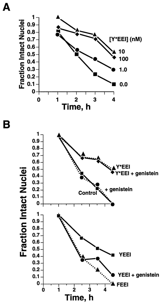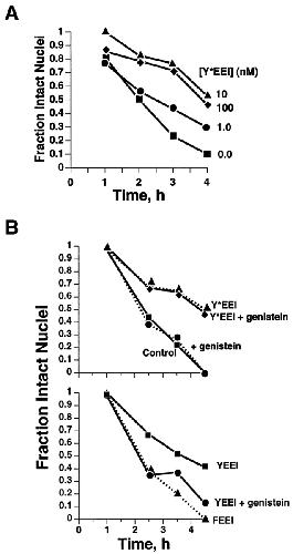 Figure 4. A synthetic peptide ligand for Src family SH2 domains, EPQY*EEIPIYLK (Y*EEI), inhibits apoptosis in the Xenopus cell-free system in a PTyr-dependent manner. (A) The indicated concentrations of phosphopeptide were added at the start of incubation. (B) (Top) The phosphopeptide (denoted by Y*EEI) was added to the extract at a final concentration of 5 nM, in the presence or absence of genistein. Genistein has no effect on its activity. (Bottom) The unphosphorylated form of this peptide (YEEI) and an unphosphorylatable mutant peptide (FEEI) were added at 5 nM. Note that the FEEI peptide has no inhibitory activity. The unphosphorylated peptide (YEEI) inhibits apoptosis nearly as well as the Y*EEI, but this inhibition is reversed in the presence of genistein. Thus, the peptide is apparently phosphorylated by a kinase present in the extract.