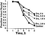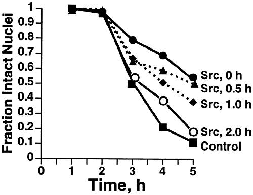 Figure 5. The Src SH2 domain inhibits an activity important in the early portion of the apoptotic process. The experiment was performed as above, except that the GST–Src SH2 fusion was added (final concentration 100 nM) at the indicated times after the start of incubation.